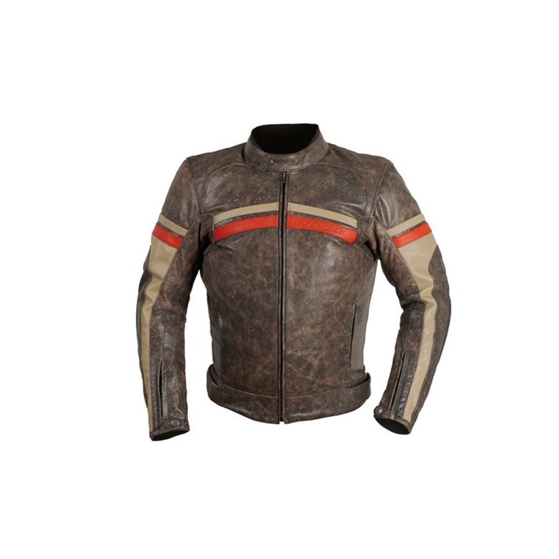 Giacca moto con protezioni per uomo.Realizzata in vera pelle bovina, tecnicamente studiata per offrire sicurezza e confort.Pensata in stile vintage si adatta benissimo ai piloti di moto custom e cafè racer.L'abbinamento dei colori e la cura nel dettaglio ne fanno un capo di grande effetto e ed ottima vestibilità.E'dotata di protezioni omologate su spalle e gomiti e fodera termica removibile.Ideale per ogni motociclista che ama essere in sintonia con la sua moto.