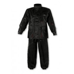 Completo giacca e pantalone impermeabile da moto di colore nero. Questa tuta offre un' efficace barriera all'acqua in caso di pioggia improvvisa durante i vostri giri in moto.