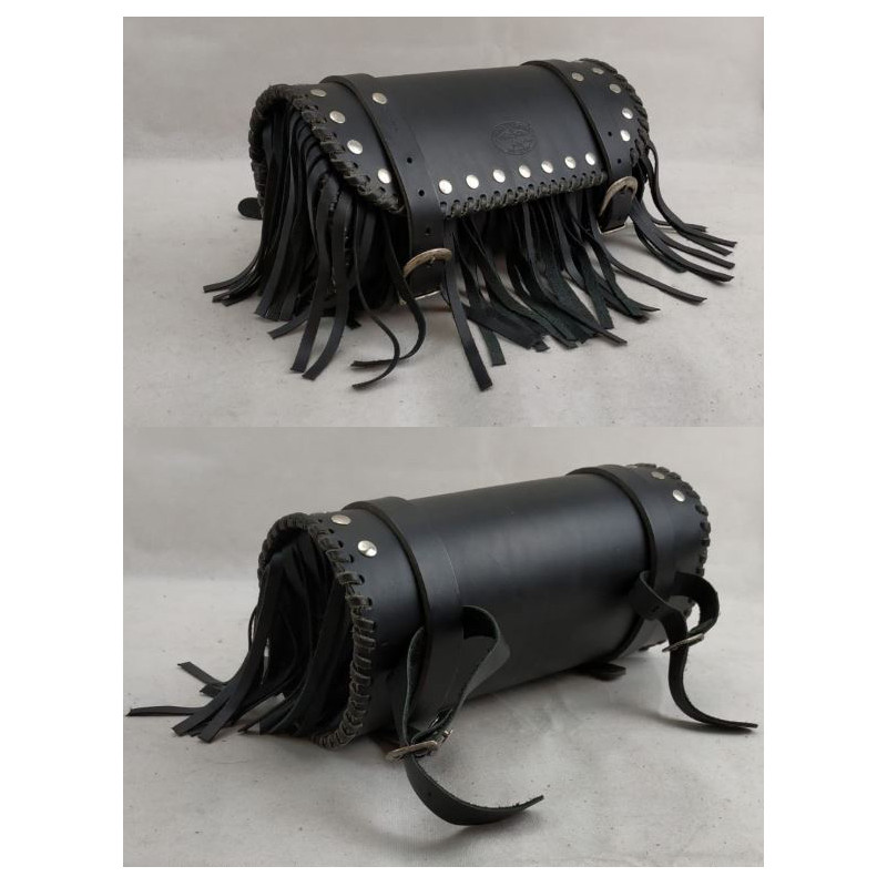 Rullo portaoggetti da forcella per moto custom. La borsa da moto custom è realizzata e rilegata a mano in vero cuoio robusto di colore nero con bulloni e frange. Il rullo portaoggetti ha una capacità di 8 litri. Questa borsa è robusta e molto pratica, ideale per la personalizzazione della vostra moto custom. Sicura e super capiente la borsa è realizzata con materiali e finiture di qualità. Perfetta per contenere al meglio tutti i tuoi oggetti personali, attrezzi o documenti durante i tuoi viaggi in moto. Ideale da applicare sulla forcella della tua moto custom donandole un look da urlo.