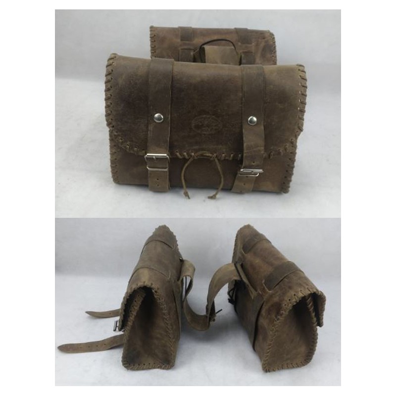 Coppia borse laterali portaoggetti per moto custom. Le borse da moto custom sono realizzate e rilegate a mano in vero cuoio robusto di colore marrone invecchiato. Le bisacce portaoggetti hanno una capacità di 18 litri. Queste borse sono spaziose, robuste e molto pratiche, ideali per la personalizzazione della vostra moto custom. Sicure e super capienti le borse sono realizzate con materiali e finiture di qualità. Perfette per contenere al meglio tutti i tuoi oggetti personali o attrezzi durante i tuoi viaggi in moto.