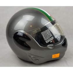 Casco modulare Project. Iil casco è realizzato in resistente policarbonato e verniciato in grigio metallizzato con bandiera italiana nel mezzo. All'interno è imbottito in materiale sfoderabile a nido d'ape traspirante e la visiera è trasparente anti-graffio. Pulsante di apertura anteriore per l'aerazione apribile e chiudibile a proprio piacimento. Aggancio e sgangio manuale. Cinturino di chiusura regolabile in lunghezza con chiusura a clip di sicurezza. Casco omologato e prodotto in Italia.