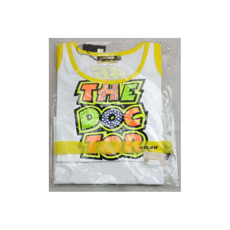 Canottiera Valentino Rossi con scritta The Doctor. La canottiera è realizzata in morbido cotone di colore bianco e scritta multicolore.