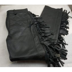 Pantaloni in pelle da moto con frange da uomo. Questi pantaloni sono realizzati in vera pelle di colore nero, sono leggeri e confortevoli per una vestibilità comoda e una piena libertà di movimento, realizzati in materiale resistente alle abrasioni. Design particolare per un capo tecnico capace di incontrare perfettamente i gusti dei motociclisti offrendo loro il giusto confort richiesto. La vestibilità comoda è assicurata grazie al taglio anatomico che rende i pantaloni confortevoli da indossare, offrono un'eccellente libertà nei movimenti, rispondendo a pieno alle esigenze dei piloti. Morbido e confortevole, buon compromesso tra praticità e comodità, questo pantalone in pelle rappresenta una novità assoluta per il mondo custom.
